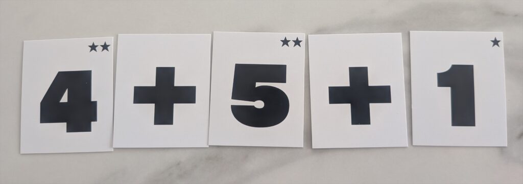 各プレイヤーの手番では、その場のカードから「数字」と「+」「-」を獲得して並べていきます。
