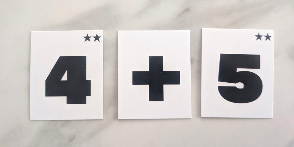 各プレイヤーは自分のターンでここから、数字1枚と「+」「-」のカード1枚を獲得して手元に並べていきます。
