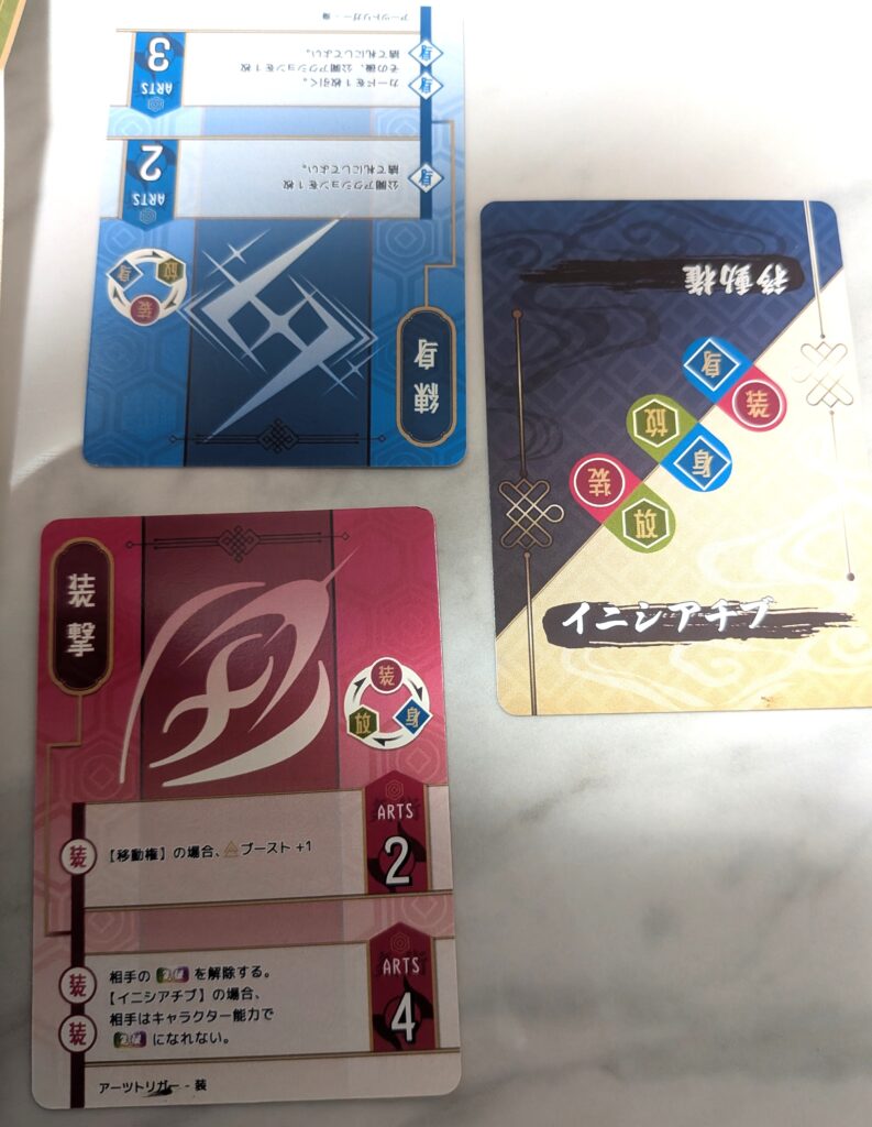 先手か後手かでそのラウンドの戦略は大分変わってくるので、先手と後手どちらを取りたいのか、どのアーツトリガーの効果を享受したいのか、手札に合致するアーツトリガーは何か、相手が出しそうなのはどれか、など状況を踏まえつつ相手との駆け引きが発生します。