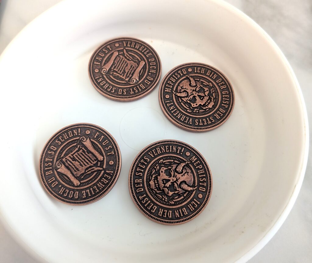 しかし、物語はそれほど単純ではありません。ファウストとメフィストは共に、相手を欺いてカードを代わりに出させる「魔法のコイン」を使うことができるのです。最後の瞬間まで、勝敗の行方は誰にもわかりません。ファウストとメフィスト、あなたはどちらのエンディングを望みますか?