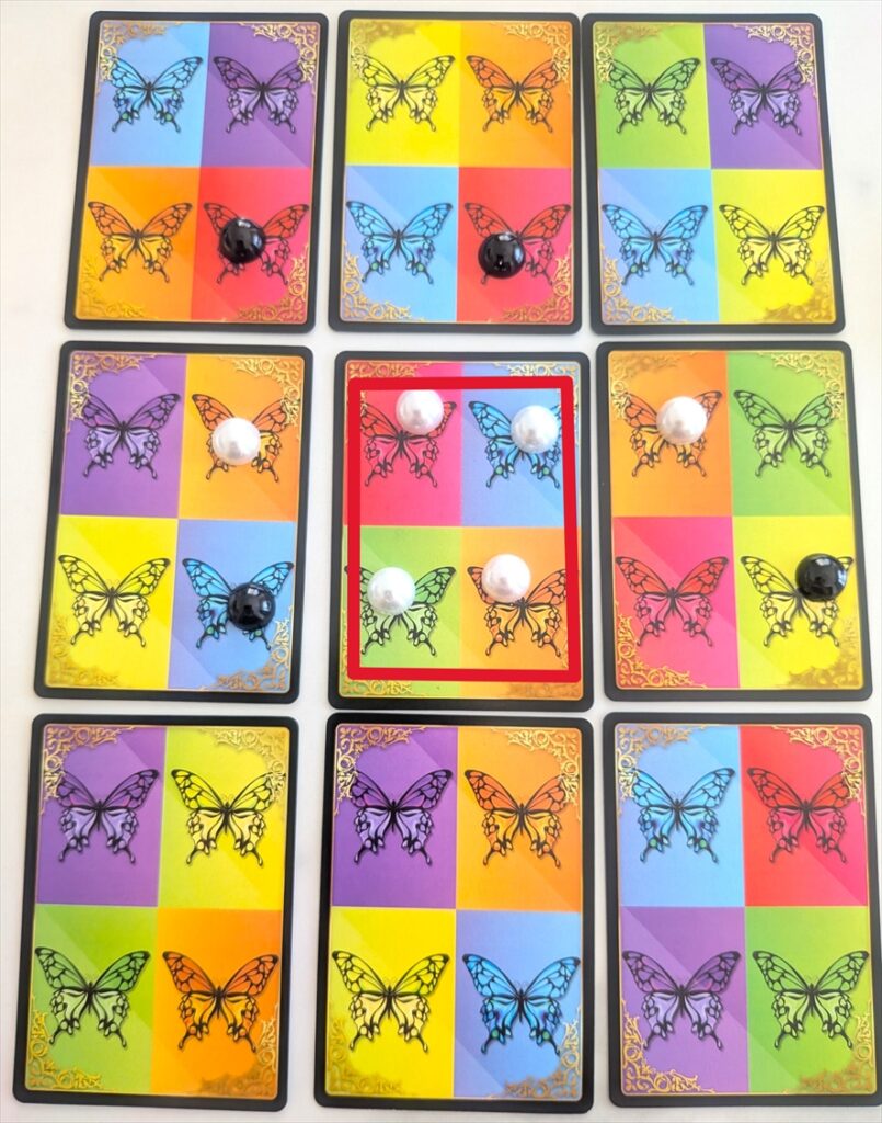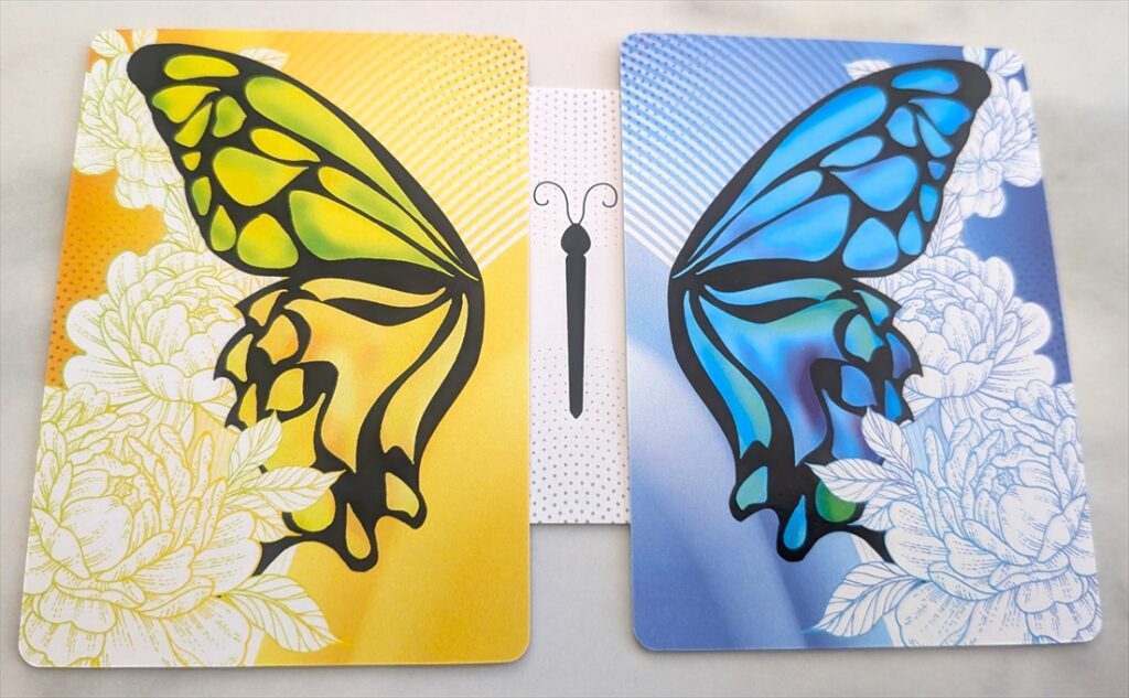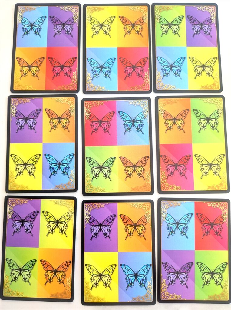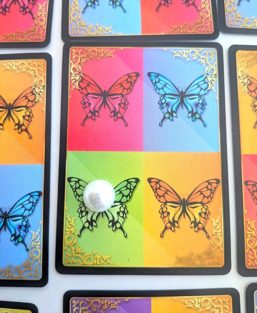 獲得した2枚の羽カードを使い、同じ色の羽カードが両翼で揃えば、見事に蝶々の完成です。
