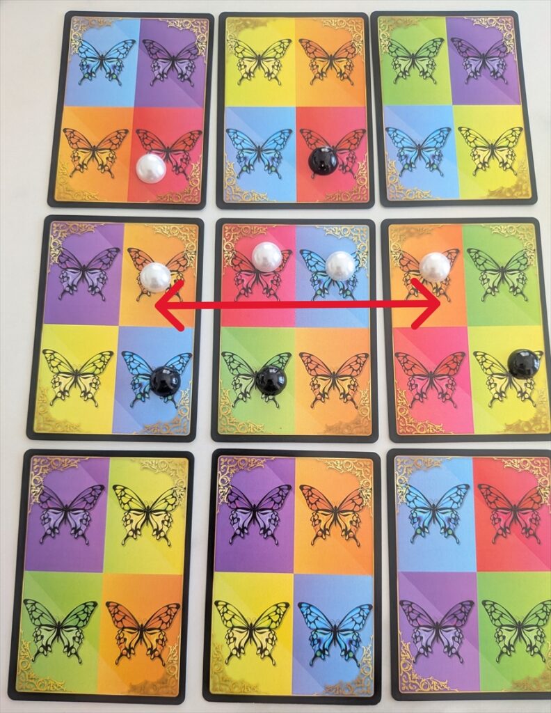 自分のターンでは、始めに未完成の蝶々の羽カードを2枚まで場に戻すことが出来ます。場に戻す際はそのままの向きで戻します。