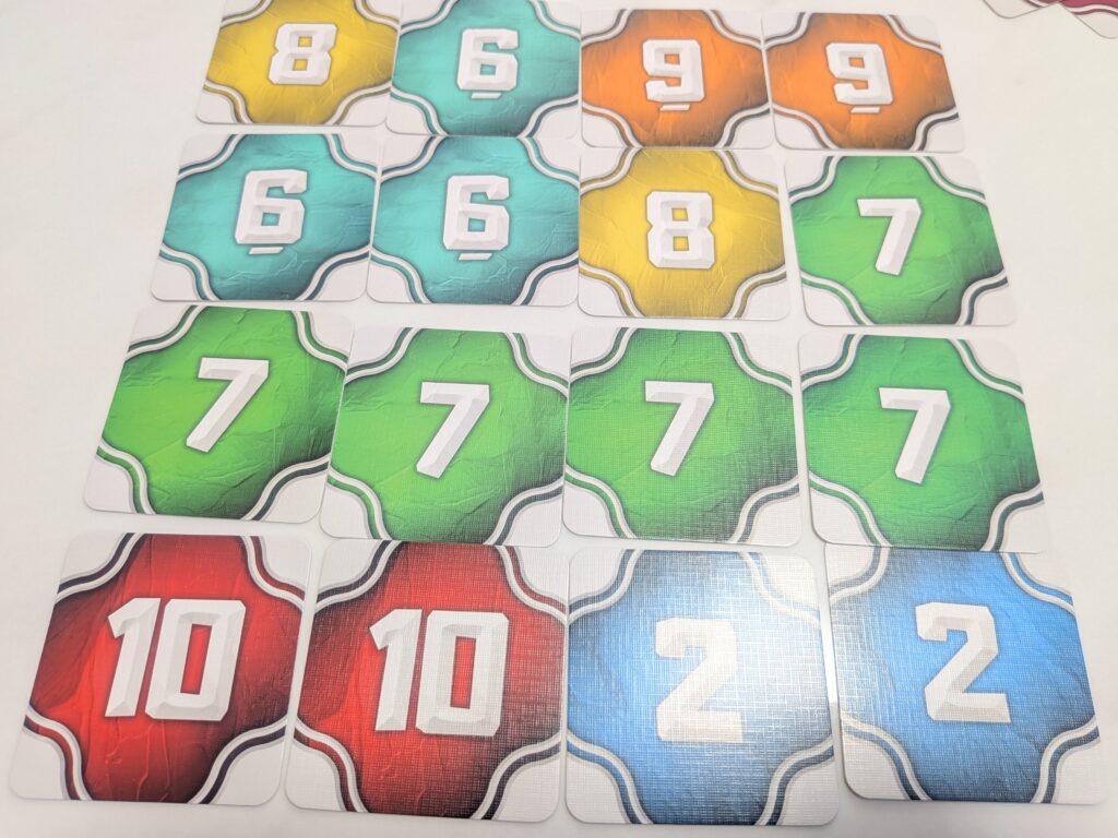 当然ながら都合よく同じ数字ばかり出るわけはないので、ある程度失点前提で複数の数字を取っていくわけですが、自分が欲しい数字なのか欲しくない数字なのか、他プレイヤーが欲しい数字なのか欲しくない数字なのか。上手く立ち回るには、その辺の情報を天秤にかけてカードを選択していく必要があります。