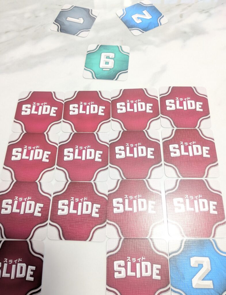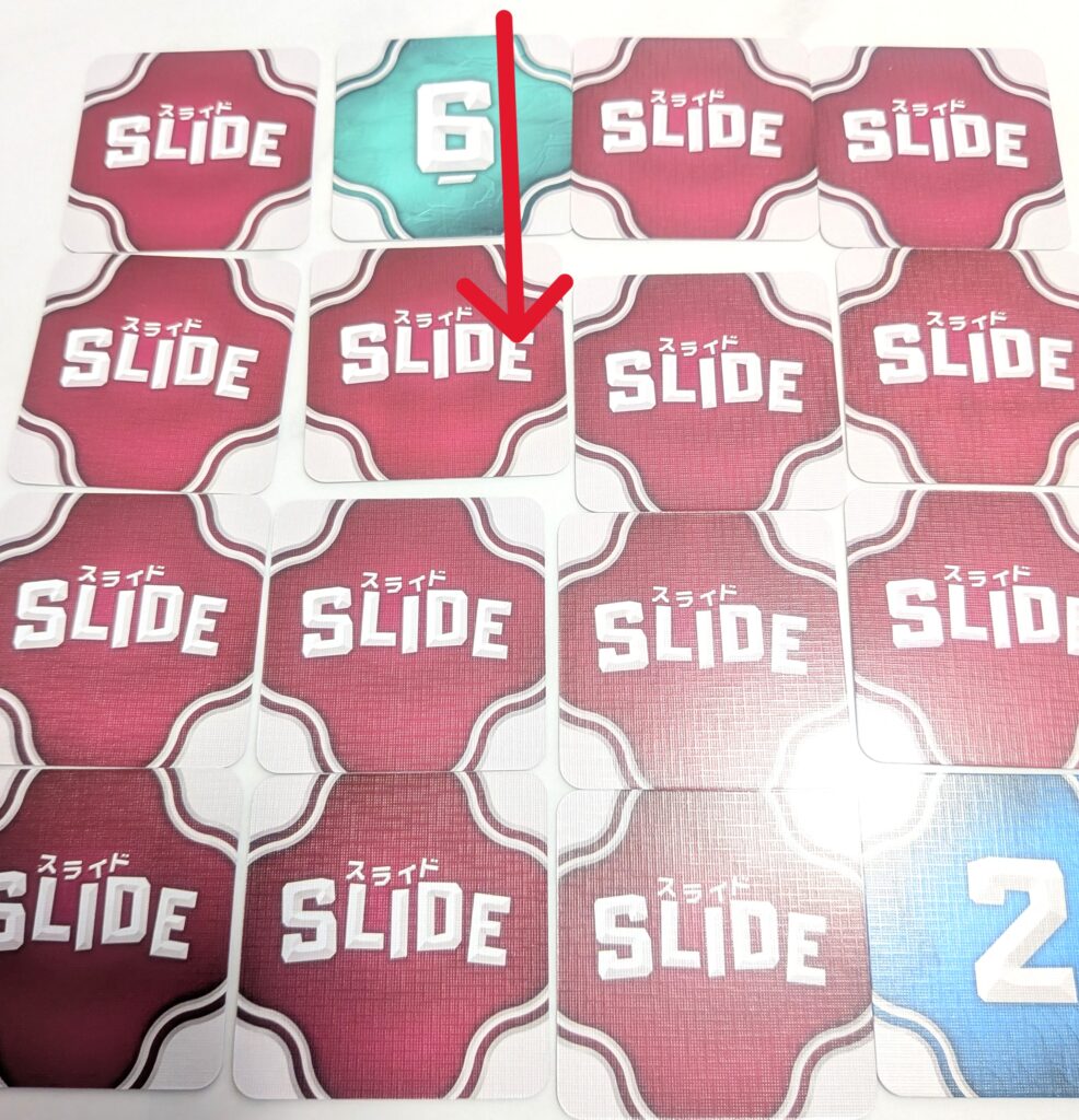 このゲームを遊んだ人は間違いなく「カードを抜いた場所にそのままカードを配置したい」と思うことがあると思います(笑)。1ゲームで2回位思いますね。ゲームの名の通り「スライド」して入れなければいけないんですよね。